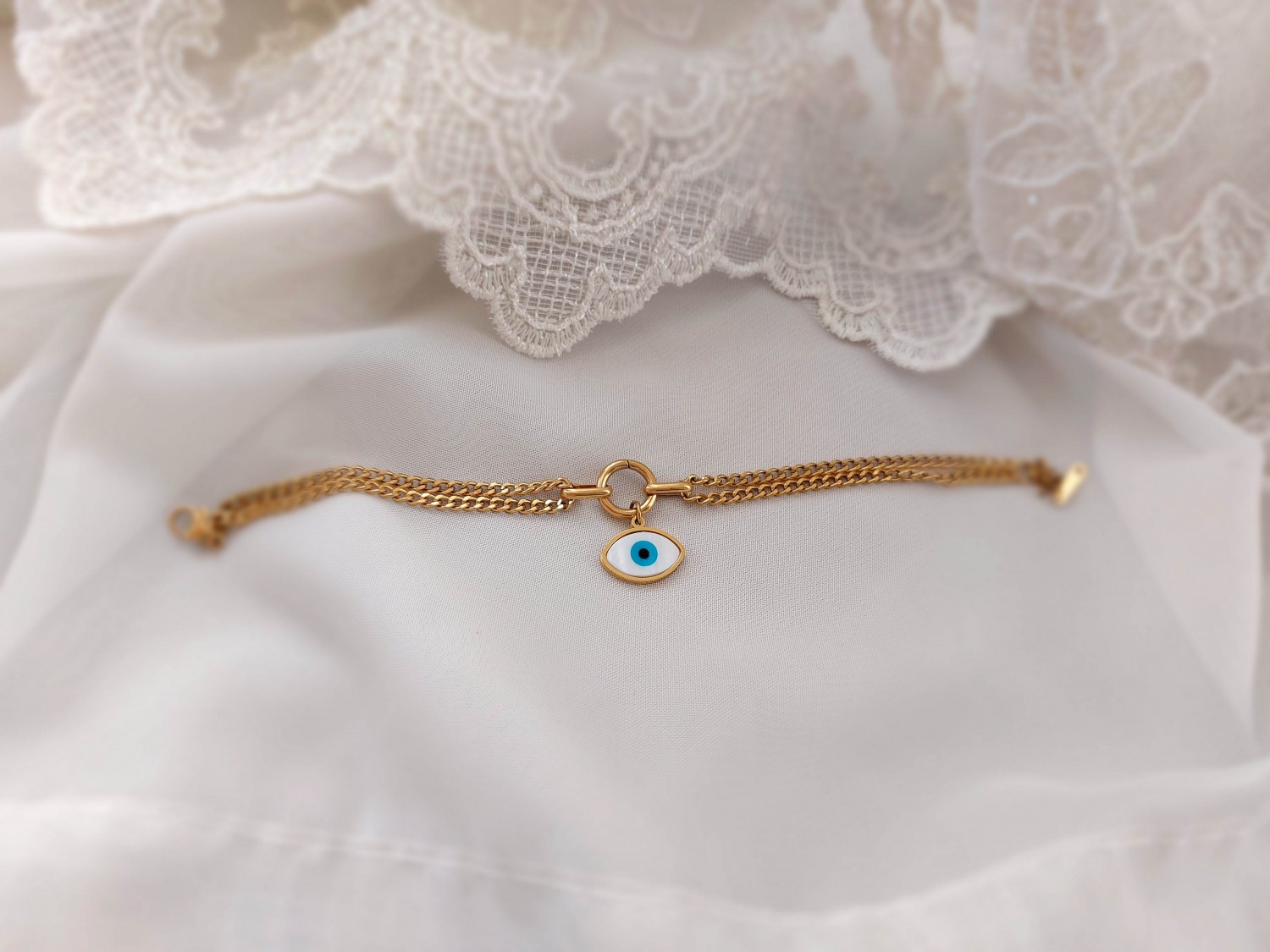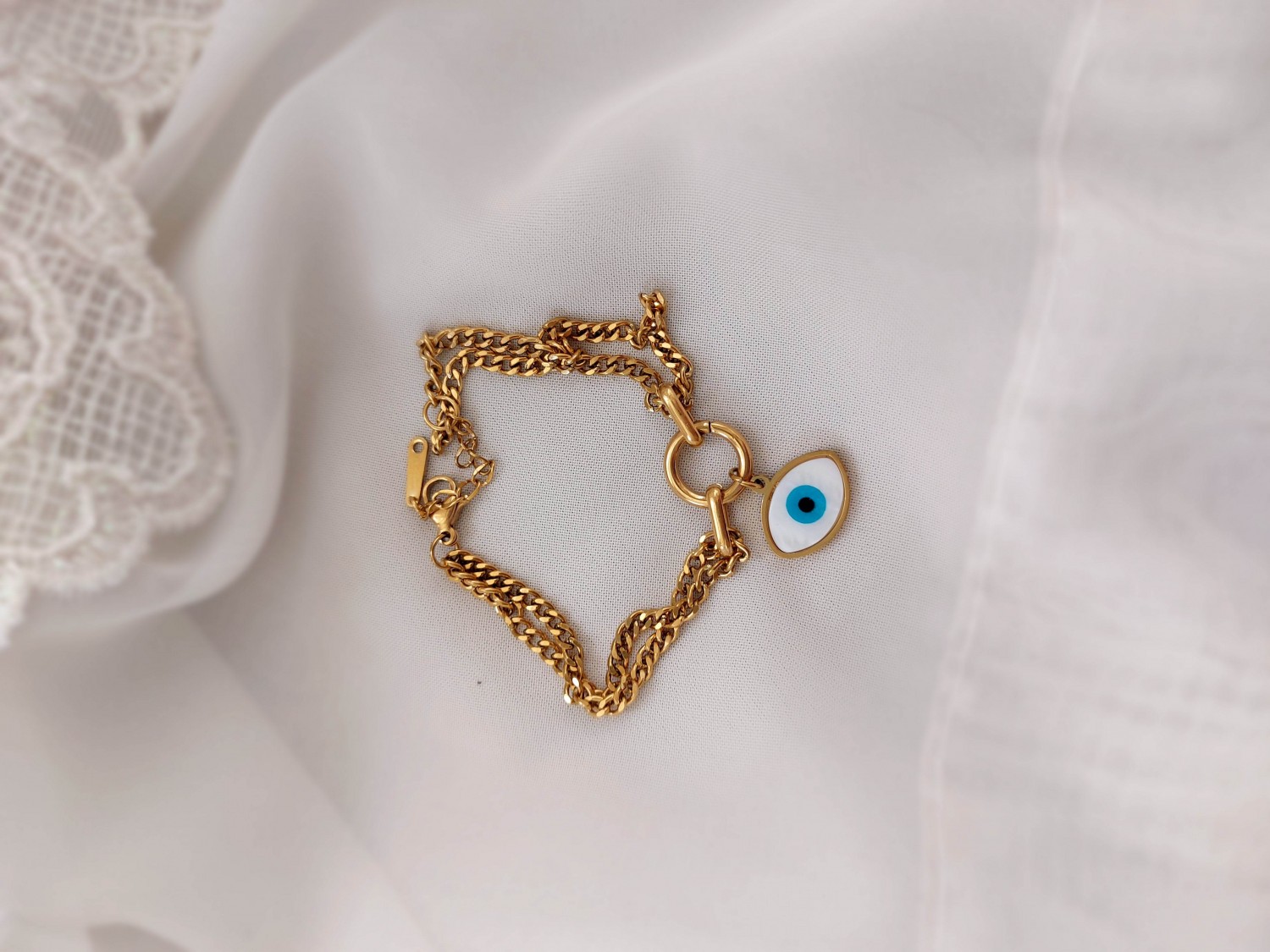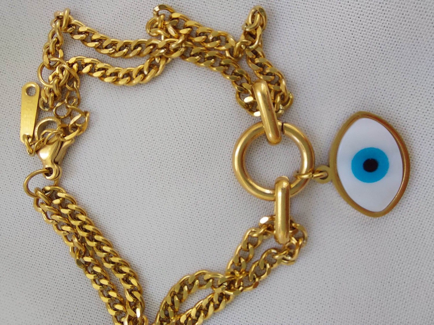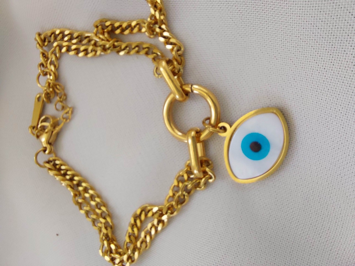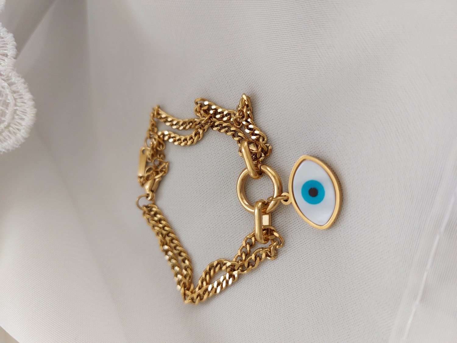 دستبند چشم نظر از جنس استیل با کیفیت با رنگ ثابت و ضد حساسیت مناسب برای استفاده روزانه میباشد.